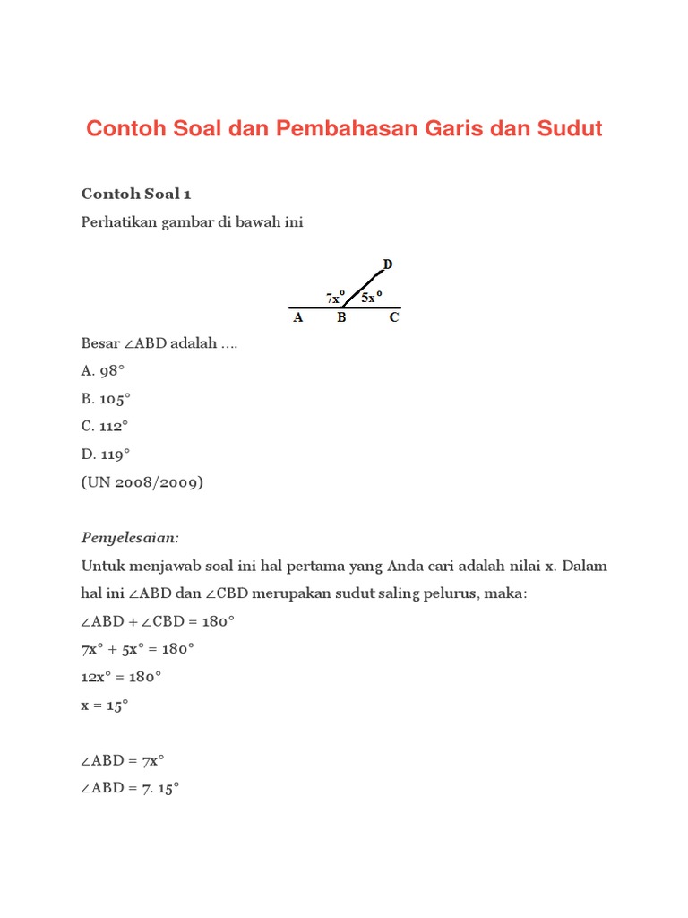 Sudut terkecil yang dibentuk oleh kedua jarum jam pada saat pukul 20.00 adalah. Berikut akan kami berikan beberapa soal terkait garis dan sudut, diantaranya yaitu: Sudut merupakan hal yang dibentuk oleh pertemuan antara dua buah sinar ataupun dua garis lurus. Perhatian** soal ini merupakan soal jebakan juga, banyak yang mengira kalau soal tersebut menanyakan ∠sqr padahal yang diminta adalah ∠pqs. 20191030 simak kumpulan soal un dengan materi garis dan sudut pada pembahasan di bawah. More images for kumpulan soal garis dan sudut » Untuk menjawab soal ini hal pertama yang anda cari adalah nilai x. See full list on yuksinau.id Mar 27, 2021 · contoh soal dan pembahasan garis dan sudut. 20201111 soal penjas materi futsal dan jawabannya ada sekitar 50 butir soal pgpilihan gandapilgan penjasorkes tentang materi olahraga. Bagaimana cara menyelesaikan masalah garis dan sudut? Dengan menghitung ketinggian matahari, pelaut dapat menentukan posisi kapal yang tepat pada garis lintang. Soal uh matematika smp kelas 7 bab garis dan sudut semester 2 www.tersatu.com i.